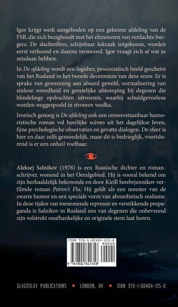 Igor krijgt werk aangeboden op een geheime afdeling van de FSB, die zich bezighoudt met het elimineren van verdachte burgers. De slachtoffers, schijnbaar lukraak uitgekozen, worden eerst verhoord en daarna vermoord. Igor vraagt zich af wat ze misdaan hebben. In De afdeling wordt een luguber, pessimistisch beeld geschetst van het Rusland in het tweede decennium van deze eeuw. Er is sprake van gewenning aan absurd geweld, normalisering van zinloze wreedheid en geestelijke afstomping bij degenen die blindelings opdrachten uitvoeren, waarbij schuldgevoelens worden weggespoeld in stromen wodka. Ironisch genoeg is De afdeling ook een onweerstaanbaar humoristische roman vol heerlijke scènes uit het dagelijkse leven, fijne psychologische observaties en gevatte dialogen. De sfeer is hier en daar zelfs gemoedelijk, maar dit is bedrieglijk, voortdurend is er een onheil voelbaar.