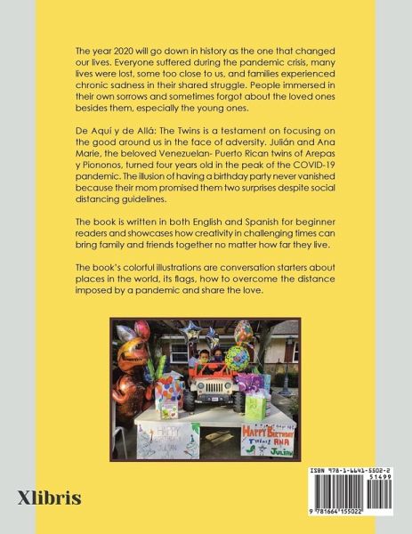 The year 2020 will go down in history as the one that changed our lives. Everyone suffered during the pandemic crisis, many lives were lost, some too close to us, and families experienced chronic sadness in their shared struggle. People immersed in their own sorrows and sometimes forgot about the loved ones besides them, especially the young ones. De Aquí y de Allá: The Twins is a testament on focusing on the good around us in the face of adversity. Julián and Ana Marie, the beloved Venezuelan- Puerto Rican twins of Arepas y Piononos, turned four years old in the peak of the COVID-19 pandemic. The illusion of having a birthday party never vanished because their mom promised them two surprises despite social distancing guidelines. The book is written in both English and Spanish for beginner readers and showcases how creativity in challenging times can bring family and friends together no matter how far they live. The book's colorful illustrations are conversation starters about places in the world, its flags, how to overcome the distance imposed by a pandemic and share the love.