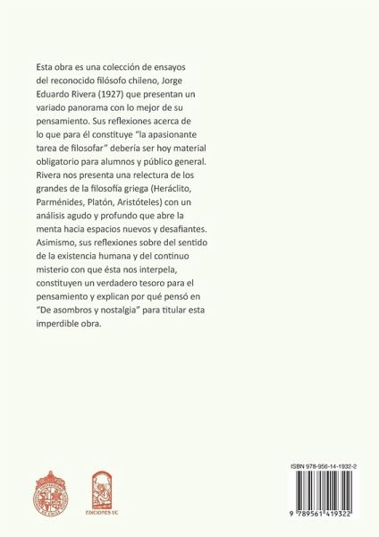 Esta colección de ensayos del reconocido filósofo chileno Jorge Eduardo Rivera, presenta un variado panorama con lo mejor de su pensamiento. Sus reflexiones acerca de lo que para él constituye "la apasionante tarea de filosofar" debería ser hoy material obligatorio para alumnos y público general. Rivera nos presenta una relectura de los grandes de la filosofía griega con un análisis agudo y profundo, que abre la mente hacia espacios nuevos y desafiantes. Sus reflexiones sobre del sentido de la existencia humana y del continuo misterio con que ésta nos interpela, constituyen un verdadero tesoro para el pensamiento.
