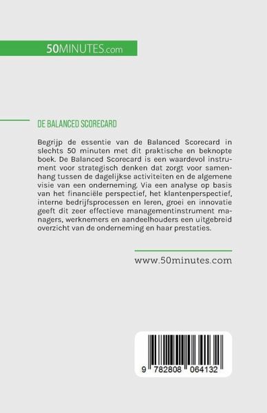 Begrijp de essentie van de Balanced Scorecard in slechts 50 minuten met dit praktische en beknopte boek. De Balanced Scorecard is een waardevol instrument voor strategisch denken dat zorgt voor samenhang tussen de dagelijkse activiteiten en de algemene visie van een onderneming. Via een analyse op basis van het financiële perspectief, het klantenperspectief, interne bedrijfsprocessen en leren, groei en innovatie geeft dit zeer effectieve managementinstrument managers, werknemers en aandeelhouders een uitgebreid overzicht van de onderneming en haar prestaties. Dit boek biedt u een handige inleiding tot de middelen en prestatie-indicatoren die aan de Balanced Scorecard zijn gekoppeld, waaronder marktaandeel, klantentrouw en medewerkerstevredenheid. Het bevat ook praktisch advies voor de toepassing van het instrument, een overzicht van de belangrijkste voor- en nadelen ervan, waaronder het niet volledig integreren van de externe omgeving, en een grondige bespreking van een casestudy. Over de Balanced Scorecard : De Balanced Scorecard combineert strategie en management, en gebruikt een reeks prestatie-indicatoren om een volledig beeld te geven van de korte- en langetermijndoelstellingen en tactieken van een bedrijf. In tegenstelling tot eerdere kaders, die minder dynamisch waren en gebaseerd op oude informatie, houdt de Balanced Scorecard rekening met operationele indicatoren, klanten en mensen om een veel grondigere evaluatie van het bedrijf te geven. In dit boek ontdekt u hoe de Balanced Scorecard uw bedrijf kan helpen, leert u over de verschillende onderdelen van het model en krijgt u inzicht in de talrijke indicatoren die erbij betrokken zijn. Een duidelijke uitleg van de voordelen en mogelijke nadelen van de methode, een bespreking van een praktische casus en een reeks praktische tips geven u de instrumenten die u nodig hebt om uw aanpak op uw situatie af te stemmen.