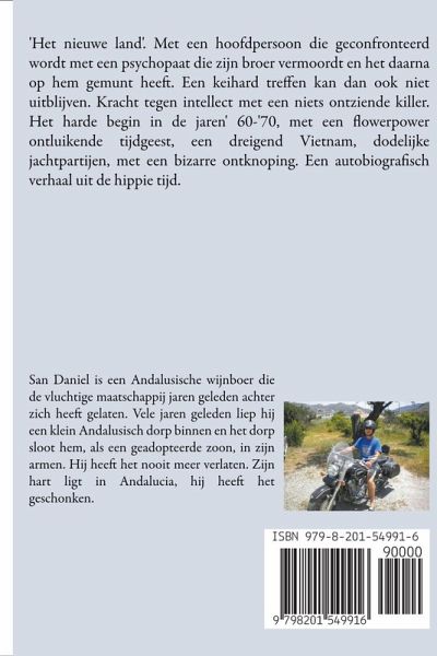 'Het nieuwe land'. Met een hoofdpersoon die geconfronteerd wordt met een psychopaat die zijn broer vermoordt en het daarna op hem gemunt heeft. Een keihard treffen kan dan ook niet uitblijven. Kracht tegen intellect met een niets ontziende killer. Het harde begin in de jaren' 60-'70, met een flowerpower ontluikende tijdgeest, een dreigend Vietnam, dodelijke jachtpartijen, met een bizarre ontknoping. Een autobiografisch verhaal uit de hippie tijd. San Daniel is een Andalusische wijnboer die de vluchtige maatschappij jaren geleden achter zich heeft gelaten. Vele jaren geleden liep hij een klein Andalusisch dorp binnen en het dorp sloot hem, als een geadopteerde zoon, in zijn armen. Hij heeft het nooit meer verlaten. Zijn hart ligt in Andalucia, hij heeft het geschonken.