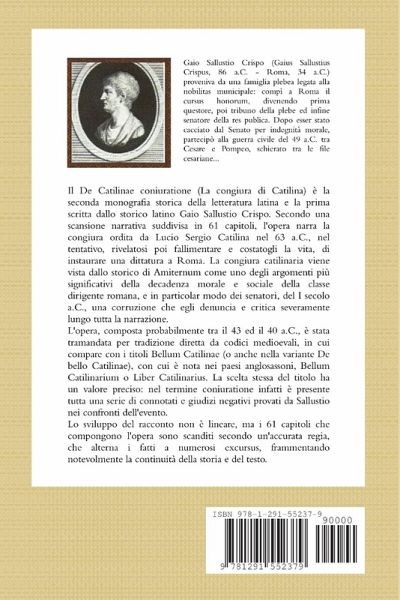 Aonia edizioni. TESTO LATINO - TESTO ITALIANO. Il De Catilinae coniuratione (La congiura di Catilina) è la seconda monografia storica della letteratura latina e la prima scritta dallo storico latino Gaio Sallustio Crispo. Secondo una scansione narrativa suddivisa in 61 capitoli, l'opera narra la congiura ordita da Lucio Sergio Catilina nel 63 a.C., nel tentativo, rivelatosi poi fallimentare e costatogli la vita, di instaurare una dittatura a Roma. La congiura catilinaria viene vista dallo storico di Amiternum come uno degli argomenti più significativi della decadenza morale e sociale della classe dirigente romana, e in particolar modo dei senatori, del I secolo a.C., una corruzione che egli denuncia e critica severamente lungo tutta la narrazione. L'opera, composta probabilmente tra il 43 ed il 40 a.C., è stata tramandata per tradizione diretta da codici medioevali, in cui compare con i titoli Bellum Catilinae, con cui è nota nei paesi anglosassoni, Bellum Catilinarium o Liber Catilinarius.