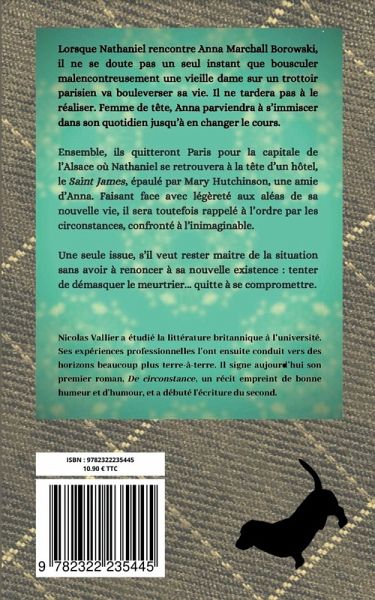 Lorsque Nathaniel rencontre Anna Marchall Borowski, il ne se doute pas un seul instant que bousculer malencontreusement une vieille dame sur un trottoir parisien va bouleverser sa vie. Il ne tardera pas à le réaliser. Femme de tête, Anna parviendra à s'immiscer dans son quotidien jusqu'à en changer le cours. Ensemble, ils quitteront Paris pour la capitale de l'Alsace où Nathaniel se retrouvera à la tête d'un hôtel, le "Saint James", épaulé par Mary Hutchinson, une amie d'Anna. Faisant face avec légèreté aux aléas de sa nouvelle vie, il sera toutefois rappelé à l'ordre par les circonstances, confronté à l'inimaginable. Une seule issue, s'il veut rester maître de la situation sans avoir à renoncer à sa nouvelle existence : tenter de démasquer le meurtrier... quitte à se compromettre. Un cadavre façon puzzle, un commissaire au bord de la crise de nerfs, un détective amateur, rêveur et idéaliste, de faux indices plus ou moins vrais et l'élucidation d'un crime : on retrouve ici tous les ingrédients du roman policier. Mais le meurtre n'est finalement qu'un prétexte autour duquel les évènements s'enchaînent, ajoutant un côté pimenté à cette histoire qui se veut légère même si sont parfois abordés des actes qui ne le sont pas. "De circonstance" est surtout un roman empreint de bonne humeur et d'humour, coloré d'optimisme, aux accents "feel good", où se côtoient des personnages attachants et hauts en couleur.