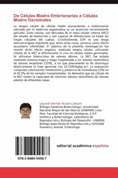 La terapia celular de células madre pluripotentes o embrionarias utilizada por la medicina regenerativa es un protocolo recientemente aplicado. Estas células, son derivadas de la masa celular interna (MCI) del estadio de blastocisto y son capaces de diferenciarse en todos los linajes celulares del cuerpo. Ciclofosfamida (CP) es una droga anticancerígena alquilante que, entre otras cosas, provoca como efecto secundario infertilidad. El objetivo de la presente investigación fue revertir dicho efecto negativo, mediante terapia celular, utilizando células de la MCI al diferenciarse in vivo en células madre germinales. Se utilizaron blastocistos de ratones albinos. La MCI fue aislada mediante inmunocirugía y luego trasplantada a los túbulos seminíferos de ratones receptores C57BL, a los que previamente se les disminuyó drásticamente la línea germinal con CP (220mg/kg pc). La evaluación comprobó colonización intraluminal y presencia de minitúbulos (2%) en el 62.5% de los receptor transplantados. Se demostró que las células de la MCI tienen la capacidad de colonizar túbulos seminíferos de ratones adultos de diferentes cepas.