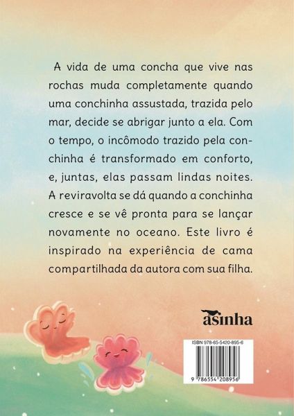 A vida de uma concha que vive nas rochas muda completamente quando uma conchinha assustada, trazida pelo mar, decide se abrigar junto a ela. Com o tempo, o incômodo trazido pela conchinha é transformado em conforto, e, juntas, elas passam lindas noites. A reviravolta se dá quando a conchinha cresce e se vê pronta para se lançar novamente no oceano, deixando a concha maior desolada com sua partida. Este livro é inspirado na experiência de cama compartilhada com sua filha.