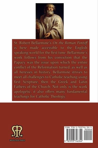 In this Theological treatise St. Robert Bellarmine takes on Protestant as well as Greek Orthodox objections to the Papacy in five books.In the first, he argues that Christ established the Primacy of Peter by means of an Ecclesiastical Monarchy, which takes up subjects as diverse as: What is the best form of government? Why it is fitting that the Church's government should be a monarchy; Exegetical Commentary on the Lord's words in Matthew 16 and John 21, along with copious Patristic testimony. In Book 2 is whether Peter has successors in the Ecclesiastical Monarchy, wherein Bellarmine defends the Church's position on the true history of Peter; that Peter truly went to Rome; that Peter was truly a Bishop there; that upon his death he was succeeded by men in the Ecclesiastical monarchy, as well as its proof from the Fathers, then through all the refutations, Bellarmine asks what would happen if the Pope were a heretic. In book 3, Bellarmine shows the many contradictions and faulty reasoning used by the first Protestants in arguing that the Pope is Antichrist while also giving exposition to the authentic understanding of the passages of Scripture that speak of Antichrist. After presenting the testimony of Scripture and the Fathers on the signs that must precede Antichrist, Bellarmine shows how none of this agrees with the Roman Pontiff. He also refutes the fable of "Pope Joan". In book 4, Bellarmine argues why the Pope is infallible when he defines a doctrine on faith and morals and proceeds to defend Popes whom Protestants and others argued had erred while defining faith. He continues to a discussion of law, and why it is not contrary to the Gospel for the Pope (or a Bishop over his diocese), to make laws that bind the faithful, refuting the teaching of John Calvin. In book 5, Bellarmine takes up the question of the Popes' power in civil affairs. Protestants had argued that the Pope tyrannously usurped the rights of sovereigns and that they meant to rule the world directly in civil affairs, while some canonists overly attached to a more medieval view were of a similar persuasion on the positive side. He then proceeds to demonstrate that the Pope's temporal power is indirect and that he can intervene for the sake of the faith when excommunicating sovereigns, but not for political reasons. The protestants argued that a Bishop could not be a temporal prince and Bishop at the same time, which Bellarmine soundly refutes from Scripture and Tradition. This first ever English translation also has many historical notes on terms, persons, Greek and Latin syntax and other things to aid the reader. The value of the work is not merely apologetic-Bellarmine's treatise also laid down insights into Catholic teaching that were foundational not only for later Theologians but even for Vatican I.