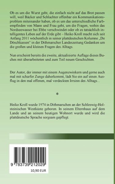 Ob es um die Wurst geht, die einfach nicht auf das Brot passen will, weil Bäcker und Schlachter offenbar ein Kommunikationsproblem miteinander haben, ob es um das unterschiedliche Farbempfinden von Mann und Frau geht, um die Fragen, wohin das Nordseewasser bei Ebbe verschwindet oder ob es tatsächlich intelligentes Leben auf der Erde gibt - Heiko Kroll macht sich seit Anfang 2011 wöchentlich in seiner plattdeutschen Kolumne "De Döschkassen" in der Dithmarscher Landeszeitung Gedanken um die großen und kleinen Fragen des Alltags. Nun erscheint bereits die zweite, aktualisierte Auflage dieses Buches mit überarbeiteten und zum Teil neuen Geschichten.Der Autor, der immer mit einem Augenzwinkern und gerne auch mal mit scharfer Zunge daherkommt, lädt Sie ein auf einen Ausflug in den mal offenen, mal verdeckten Irrsinn des Alltags ...