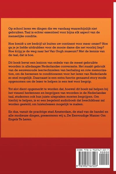 Op school leren we dingen die we vandaag waarschijnlijk niet gebruiken. Taal is echter essentieel voor bijna elk aspect van de menselijke conditie. Hoe breidt u uw bedrijf uit buiten uw continent voor meer omzet? Hoe ga je je liefde uitdrukken voor de mooie dame die net voorbij liep? Hoe krijg je de weg naar het Van Gogh museum? Met de kennis van de taal, dat is hoe. Dit boek bevat een lexicon van enkele van de meest gebruikte woorden in alledaagse Nederlandse conversatie. Het maakt gebruik van de eeuwenoude leertechnieken van herhaling en rote memorization, om de hersenen te conditioneren voor het leren van Nederlands zo snel mogelijk. Daarnaast is een extra functie genaamd story mode opgenomen om de lezer te helpen in een test voor begrip. Tot slot dient opgemerkt te worden dat, hoewel dit boek zal helpen bij het visueel herkennen en begrijpen van woorden in de Nederlandse taal, studenten ook hun juiste uitspraken moeten begrijpen. Om hierbij te helpen, is er een begeleid audioboek dat beschikbaar zal worden gesteld, om luisterlessen mogelijk te maken. En dus, vanuit de prachtige stad Amsterdam, de stad van de handel en alle modieuze dingen, presenteren wij u, De Eenvoudige Manier Om Engels Te Leren.