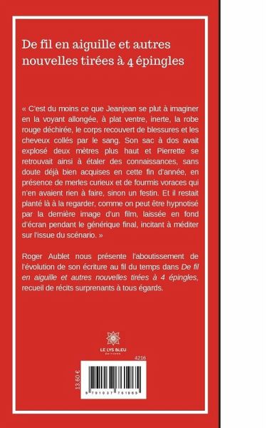« C¿est du moins ce que Jeanjean se plut à imaginer en la voyant allongée, à plat ventre, inerte, la robe rouge déchirée, le corps recouvert de blessures et les cheveux collés par le sang. Son sac à dos avait explosé deux mètres plus haut et Pierrette se retrouvait ainsi à étaler des connaissances, sans doute déjà bien acquises en cette fin d¿année, en présence de merles curieux et de fourmis voraces qui n¿en avaient rien à faire, sinon un festin. Et il restait planté là à la regarder, comme on peut être hypnotisé par la dernière image d¿un film, laissée en fond d¿écran pendant le générique final, incitant à méditer sur l¿issue du scénario. » Roger Aublet nous présente l¿aboutissement de l¿évolution de son écriture au fil du temps dans De fil en aiguille et autres nouvelles tirées à 4 épingles, recueil de récits surprenants à tous égards.