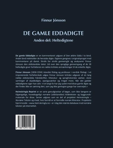 De gamle Eddadigte er en kommenteret udgave af Den ældre Edda i to bind. Andet bind indeholder de heroiske digte. Digtene gengives i originalsproget med kommentarer på dansk. Strofe for strofe gennemgår og analyserer Finnur Jónsson den oldislandske tekst. Ud over den sproglige gennemgang af de 18 heltedigte giver forfatteren en række kritiske anmærkninger til de enkelte digte.