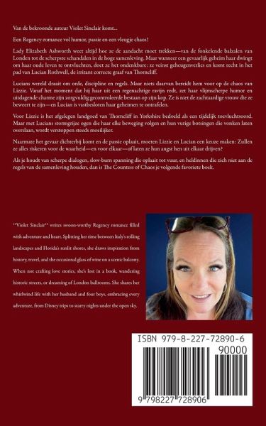Van de bekroonde auteur Violet Sinclair komt... Een Regency-romance vol humor, passie en een vleugje chaos! Lady Elizabeth Ashworth weet altijd hoe ze de aandacht moet trekken-van de fonkelende balzalen van Londen tot de scherpste schandalen in de hoge samenleving. Maar wanneer een gevaarlijk geheim haar dwingt om haar oude leven te ontvluchten, doet ze het ondenkbare: ze veinst geheugenverlies en komt recht in het pad van Lucian Rothwell, de irritant correcte graaf van Thorncliff. Lucians wereld draait om orde, discipline en regels. Maar niets daarvan bereidt hem voor op de chaos van Lizzie. Vanaf het moment dat hij haar uit een regenachtige ravijn redt, zet haar vlijmscherpe humor en uitdagende charme zijn zorgvuldig gecontroleerde bestaan op zijn kop. Ze is niet de zachtaardige vrouw die ze beweert te zijn-en Lucian is vastbesloten haar geheimen te ontrafelen. Voor Lizzie is het afgelegen landgoed van Thorncliff in Yorkshire bedoeld als een tijdelijk toevluchtsoord. Maar met Lucians stormgrijze ogen die haar elke beweging volgen en hun vurige botsingen die vonken laten overslaan, wordt verstoppen steeds moeilijker. Naarmate het gevaar dichterbij komt en de passie oplaait, moeten Lizzie en Lucian een keuze maken: Zullen ze alles riskeren voor de waarheid-en voor elkaar-of laten ze hun angst hen uit elkaar drijven? Als je houdt van scherpe dialogen, slow-burn spanning die oplaait tot vuur, en heldinnen die zich niet aan de regels van de samenleving houden, dan is The Countess of Chaos je volgende favoriete boek.
