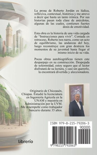 La prosa de Roberto Jordán es lúdica, reflexiva, contextual, histórica y me atrevo a decir que hasta un tanto irónica. Por sus historias pasan toda clase de anécdotas, algunas de las cuales, contienen fuertes dosis de emotividad. Esta obra es la historia de una vida cargada de "Instrucciones para vivir". Contada en retroceso, Roberto nos narra, como un acto de equilibrismo, las andanzas del hoy, luego reconstruye con gran destreza los momentos de su juventud hasta llegar al mismo inicio de su vida. Pocas obras autobiográficas tienen este desparpajo en su construcción. Despojada de solemnidad, estoy seguro que el lector disfrutará de su lectura, y casi sin quererlo, la encontrará divertida y aleccionadora. SOBRE EL AUTOR Originario de Chicoasén, Chiapas. Estudié la licenciatura en Ingeniería Agricola en la UNAM y maestría en Administración por la UVM. Me desempeñé como trabajador bancario durante 35 años.