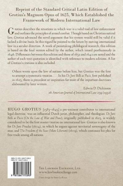 Reprint of the standard critical Latin edition of Grotius's magnum opus of 1625, which established the framework of modern international law. Originally published: Leiden: A.W. Sijthoff. 1919. xv, 752 pp. Grotius describes the situations in which war is a valid tool of law enforcement and outlines the principles of armed combat. Though based on Christian natural law, Grotius advanced the novel argument that his system would still be valid if it lacked a divine basis. In this regard he pointed to the future by moving international law in a secular direction. A work of painstaking philological research, this edition is based on the final version edited by the author, which issued posthumously in 1646. Differences between this edition and those of 1632 and 1642 are noted and the author of each text quotation is identified with reference to modern editions. A list of Grotius's citations is also included. "Others wrote upon the law of nations before him, but Grotius was the first to attempt a systematic treatise. . . . In his De Jure Belli ac Pacis, first published in 1625, there is precedent or inspiration for most of the important doctrines elaborated by later writers." -- Edwin D. Dickinson, 26 American Journal of International Law 239 (1932) Hugo Grotius [1583-1645] a pre-eminent contributor to international legal doctrine, was an influential Dutch jurist, philosopher, and theologian. De Jure Belli ac Pacis (On the Law of War and Peace), originally published in 1625, is widely considered to be the first master treatise on international law. Grotius is also known for De Jure Praedae (1604), in which he argues against territorial sovereignty of the seas, and The Freedom of the Seas (Mare Liberum) (1609), which continues his plea for free trade among all nations.