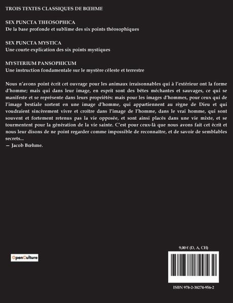 TROIS TEXTES CLASSIQUES DE B¿HME SEX PUNCTA THEOSOPHICA De la base profonde et sublime des six points théosophiques SEX PUNCTA MYSTICA Une courte explication des six points mystiques MYSTERIUM PANSOPHICUM Une instruction fondamentale sur le mystère céleste et terrestre Nous n¿avons point écrit cet ouvrage pour les animaux irraisonnables qui à l¿extérieur ont la forme d¿homme; mais qui dans leur image, en esprit sont des bêtes méchantes et sauvages, ce qui se manifeste et se représente dans leurs propriétés: mais pour les images d¿hommes, pour ceux qui de l¿image bestiale sortent en une image d¿homme, qui appartiennent au règne de Dieu et qui voudraient sincèrement vivre et croître dans l¿image de l¿homme, dans le vrai homme, qui sont souvent et fortement retenus pas la vie opposée, et sont ainsi placés dans une vie mixte, et se tourmentent pour la génération de la vie sainte. C¿est pour ceux-là que nous avons fait cet écrit et nous leur disons de ne point regarder comme impossible de reconnaître, et de savoir de semblables secrets... ¿ Jacob B¿hme.
