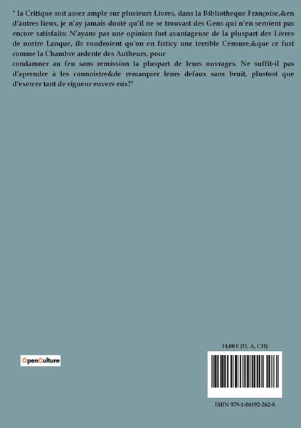 " la Critique soit assez ample sur plusieurs Livres, dans la Bibliotheque Françoise, en d¿autres lieux, je n¿ay jamais douté qüil ne se trouvast des Gens qui n¿en seroient pas encore satisfaits: N¿ayans pas une opinion fort avantageuse de la pluspart des Livres de nostre Lanque, ils voudroient qüon en fisticy une terrible Censure, et que ce fust comme la Chambre ardente des Autheurs, pour condamner au feu sans remission la pluspart de leurs ouvrages. Ne suffit-il pas d¿aprendre à les connoistre&de remarquer leurs defaux sans bruit, plustost que d¿exercer tant de rigueur envers eux?"