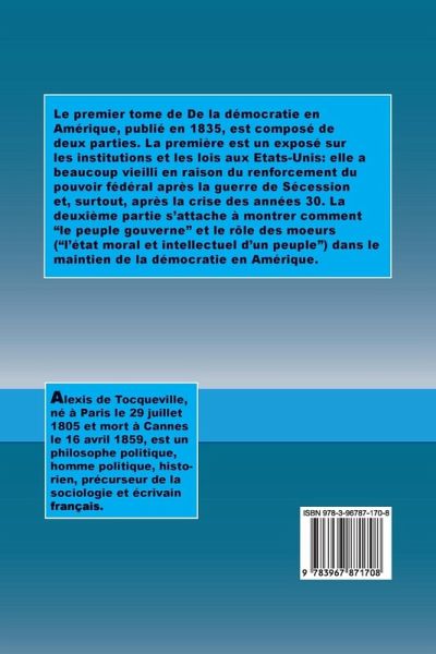 Le premier tome de De la démocratie en Amérique, publié en 1835, est composé de deux parties. La première est un exposé sur les institutions et les lois aux Etats-Unis: elle a beaucoup vieilli en raison du renforcement du pouvoir fédéral après la guerre de Sécession et, surtout, après la crise des années 30. La deuxième partie s'attache à montrer comment "le peuple gouverne" et le rôle des moeurs ("l'état moral et intellectuel d'un peuple") dans le maintien de la démocratie en Amérique.