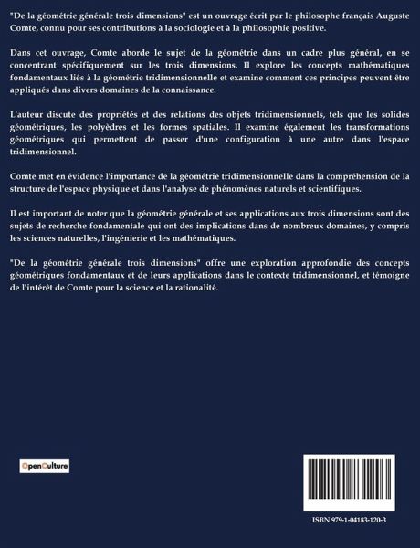 Imaginez un monde où les dimensions ne se limitent pas à notre perception habituelle. ' De la géométrie générale trois dimensions ' d'Auguste Comte nous transporte dans l'univers des mathématiques du XIXe siècle, une époque où les esprits les plus brillants s'efforçaient de repousser les limites de la connaissance. Ce traité, ancré dans le contexte de l'évolution scientifique, explore les fondements de la géométrie tridimensionnelle, un domaine qui a ouvert la voie à de nombreuses avancées scientifiques et technologiques. Comte, philosophe et mathématicien, s'attache à démontrer comment les principes géométriques peuvent être appliqués pour mieux comprendre notre environnement et les phénomènes naturels qui nous entourent. À travers une analyse rigoureuse, l'auteur nous guide dans un voyage intellectuel où les concepts abstraits prennent forme et deviennent des outils pour décrypter le monde. Les thématiques abordées dans cet ouvrage, telles que la spatialité, la mesure et la structure, sont autant de moyens pour appréhender les complexités de l'univers. Comte, dans son évolution, nous invite à considérer la géométrie non seulement comme une science des formes et des volumes, mais aussi comme une discipline essentielle pour le progrès de la pensée humaine. En nous plongeant dans cet ouvrage, nous découvrons une nouvelle manière de percevoir la réalité, où chaque ligne et chaque angle révèlent des vérités cachées. Ce livre nous offre une perspective enrichissante sur la manière dont les mathématiques peuvent transformer notre compréhension du monde, nous incitant à voir au-delà des apparences et à embrasser la beauté de la logique et de la raison.