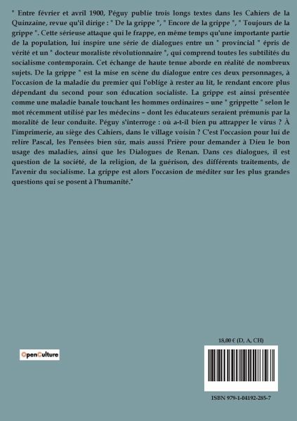" Durant l'hiver 1899-1900, alors qu'une épidémie de grippe sévit, Charles Péguy, jeune fondateur des "Cahiers de la Quinzaine", est terrassé par le virus. Péguy publie alors trois longs textes dans la revue qu'il dirige : " De la grippe ", " Encore de la grippe ", " Toujours de la grippe " (datés respectivement de février, mars et avril 1900). Cette grippe qui le frappe, en même temps qu'une importante partie de la population, lui inspire une série de dialogues entre un " provincial " épris de vérité et un " docteur moraliste révolutionnaire ", qui comprend toutes les subtilités du socialisme contemporain...
