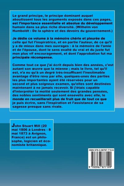 Le grand principe, le principe dominant auquel aboutissent tous les arguments exposés dans ces pages, est l'importance essentielle et absolue du développement humain dans sa plus riche diversité. (Wilhelm von Humboldt : De la sphère et des devoirs du gouvernement.) Je dédie ce volume à la mémoire chérie et pleurée de celle qui fut l'inspiratrice, et en partie l'auteur, de ce qu'il y a de mieux dans mes ouvrages : à la mémoire de l'amie et de l'épouse, dont le sens exalté du vrai et du juste fut mon plus vif encouragement, et dont l'approbation fut ma principale récompense. Comme tout ce que j'ai écrit depuis bien des années, c'est autant son ¿uvre que la mienne ; mais le livre, tel qu'il est, n'a eu qu'à un degré très-insuffisant l'inestimable avantage d'être revu par elle, quelques-unes des parties les plus importantes ayant été réservées pour un second et plus soigneux examen, qu'elles sont destinées maintenant à ne jamais recevoir. Si j'étais capable d'interpréter la moitié seulement des grandes pensées, des nobles sentiments qui sont ensevelis avec elle, le monde en recueillerait plus de fruit que de tout ce que je puis écrire, sans l'inspiration et l'assistance de sa sagesse presque sans rivale.