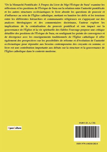 "De la Monarchi Pontificale: À Propos du Livre de Mgr l'Évêque de Sura" examine les réflexions et les positions de l'Évêque de Sura sur la relation entre l'autorité pontificale et les autres structures ecclésiastiques le livre aborde les questions de pouvoir et d'influence au sein de l'Église catholique, mettant en lumière les défis et les tensions entre les différentes hiérarchies et communautés religieuses en s'appuyant sur des analyses théologiques et des commentaires doctrinaux, l'auteur explore les implications de la centralisation du pouvoir pontifical et son impact sur la gouvernance de l'Église et la vie spirituelle des fidèles l'ouvrage propose une critique détaillée des positions de l'Évêque de Sura, en soulignant les points de convergence et de divergence avec les enseignements traditionnels de l'Église catholique il offre également des perspectives sur les possibilités de réforme et d'évolution de l'autorité ecclésiastique pour répondre aux besoins contemporains des croyants en somme, ce livre est une contribution importante aux débats sur la structure et la gouvernance de l'Église catholique dans le contexte moderne.