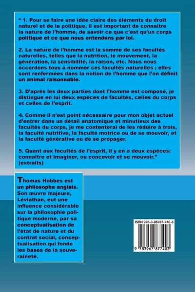 " 1. Pour se faire une idée claire des éléments du droit naturel et de la politique, il est important de connaître la nature de l'homme, de savoir ce que c'est qu'un corps politique et ce que nous entendons par loi. 2. La nature de l'homme est la somme de ses facultés naturelles, telles que la nutrition, le mouvement, la génération, la sensibilité, la raison, etc. Nous nous accordons tous à nommer ces facultés naturelles ; elles sont renfermées dans la notion de l'homme que l'on définit un animal raisonnable. 3. D'après les deux parties dont l'homme est composé, je distingue en lui deux espèces de facultés, celles du corps et celles de l'esprit. 4. Comme il n'est point nécessaire pour mon objet actuel d'entrer dans un détail anatomique et minutieux des facultés du corps, je me contenterai de les réduire à trois, la faculté nutritive, la faculté motrice ou de se mouvoir, et la faculté générative ou de se propager. 5. Quant aux facultés de l'esprit, il y en a deux espèces: connaître et imaginer, ou concevoir et se mouvoir." (extraits)