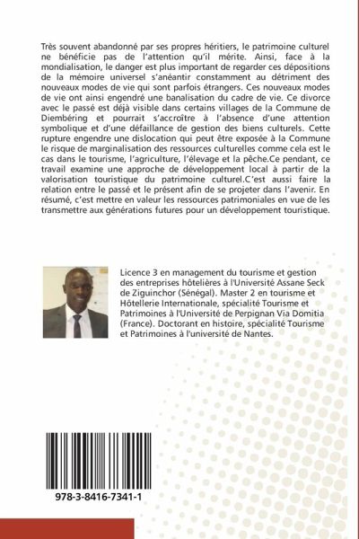Très souvent abandonné par ses propres héritiers, le patrimoine culturel ne bénéficie pas de l'attention qu'il mérite. Ainsi, face à la mondialisation, le danger est plus important de regarder ces dépositions de la mémoire universel s'anéantir constamment au détriment des nouveaux modes de vie qui sont parfois étrangers. Ces nouveaux modes de vie ont ainsi engendré une banalisation du cadre de vie. Ce divorce avec le passé est déjà visible dans certains villages de la Commune de Diembéring et pourrait s'accroître à l'absence d'une attention symbolique et d'une défaillance de gestion des biens culturels. Cette rupture engendre une dislocation qui peut être exposée à la Commune le risque de marginalisation des ressources culturelles comme cela est le cas dans le tourisme, l'agriculture, l'élevage et la pêche.Ce pendant, ce travail examine une approche de développement local à partir de la valorisation touristique du patrimoine culturel.C'est aussi faire la relation entre le passé et le présent afin de se projeter dans l'avenir. En résumé, c'est mettre en valeur les ressources patrimoniales en vue de les transmettre aux générations futures pour un développement touristique.