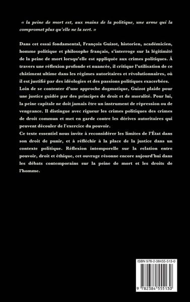 la peine de mort est, aux mains de la politique, une arme qui la compromet plus qu'elle ne la sert. Dans cet essai fondamental, François Guizot, historien, académicien, homme politique et philosophe français, s'interroge sur la légitimité de la peine de mort lorsqu'elle est appliquée aux crimes politiques. À travers une réflexion profonde et nuancée, il critique l'utilisation de ce châtiment ultime dans les régimes autoritaires et révolutionnaires, où il est justifié par des idéologies et des passions politiques exacerbées.Loin de se contenter d'une approche dogmatique, Guizot plaide pour une justice guidée par des principes de droit et de moralité. Pour lui, la peine capitale ne doit jamais être un instrument de répression ou de vengeance. Il distingue avec rigueur les crimes politiques des crimes de droit commun et met en garde contre les dérives autoritaires qui peuvent découler de l'exercice du pouvoir.Ce texte essentiel nous invite à reconsidérer les limites de l'État dans son droit de punir, et à réfléchir à la place de la justice dans un contexte politique. Réflexion intemporelle sur la relation entre pouvoir, droit et éthique, cet ouvrage résonne encore aujourd'hui dans les débats contemporains sur la peine de mort et les droits de l'homme.