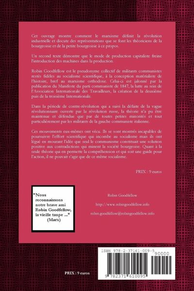 Cet ouvrage montre comment le marxisme définit la révolution industrielle et discute des représentations que se font les théoriciens de la bourgeoisie et de la petite bourgeoisie à ce propos. Un second texte démontre que le mode de production capitaliste freine l'introduction des machines dans la production.