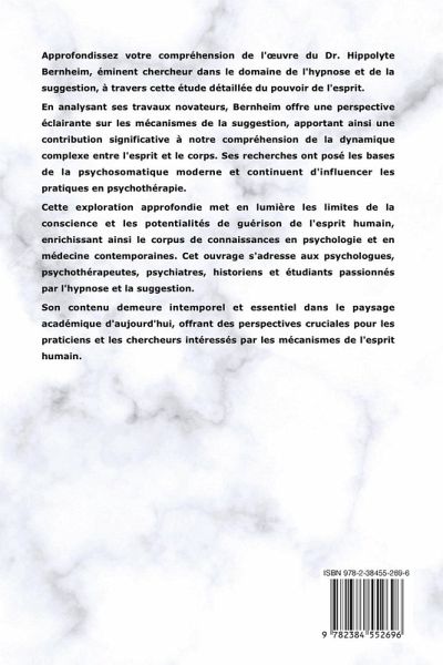 Approfondissez votre compréhension de l'¿uvre du Dr. Hippolyte Bernheim, éminent chercheur dans le domaine de l'hypnose et de la suggestion, à travers cette étude détaillée du pouvoir de l'esprit. En analysant ses travaux novateurs, Bernheim offre une perspective éclairante sur les mécanismes de la suggestion, apportant ainsi une contribution significative à notre compréhension de la dynamique complexe entre l'esprit et le corps. Ses recherches ont posé les bases de la psychosomatique moderne et continuent d'influencer les pratiques en psychothérapie. Cette exploration approfondie met en lumière les limites de la conscience et les potentialités de guérison de l'esprit humain, enrichissant ainsi le corpus de connaissances en psychologie et en médecine contemporaines. Cet ouvrage s'adresse aux psychologues, psychothérapeutes, psychiatres, historiens et étudiants passionnés par l'hypnose et la suggestion. Son contenu demeure intemporel et essentiel dans le paysage académique d'aujourd'hui, offrant des perspectives cruciales pour les praticiens et les chercheurs intéressés par les mécanismes de l'esprit humain.