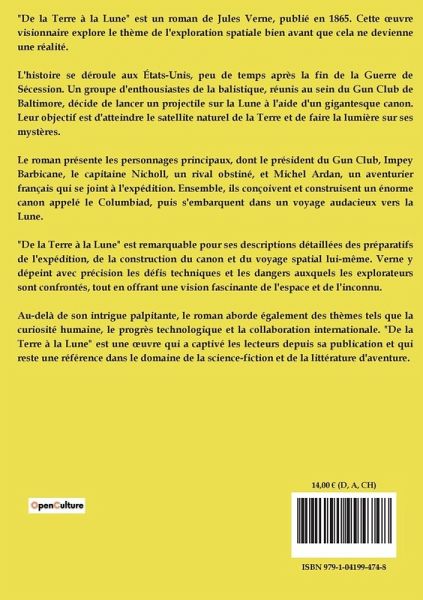 "De la Terre à la Lune" est un roman de Jules Verne, publié en 1865. Cette ¿uvre visionnaire explore le thème de l'exploration spatiale bien avant que cela ne devienne une réalité. L'histoire se déroule aux États-Unis, peu de temps après la fin de la Guerre de Sécession. Un groupe d'enthousiastes de la balistique, réunis au sein du Gun Club de Baltimore, décide de lancer un projectile sur la Lune à l'aide d'un gigantesque canon. Leur objectif est d'atteindre le satellite naturel de la Terre et de faire la lumière sur ses mystères. Le roman présente les personnages principaux, dont le président du Gun Club, Impey Barbicane, le capitaine Nicholl, un rival obstiné, et Michel Ardan, un aventurier français qui se joint à l'expédition. Ensemble, ils conçoivent et construisent un énorme canon appelé le Columbiad, puis s'embarquent dans un voyage audacieux vers la Lune. "De la Terre à la Lune" est remarquable pour ses descriptions détaillées des préparatifs de l'expédition, de la construction du canon et du voyage spatial lui-même. Verne y dépeint avec précision les défis techniques et les dangers auxquels les explorateurs sont confrontés, tout en offrant une vision fascinante de l'espace et de l'inconnu. Au-delà de son intrigue palpitante, le roman aborde également des thèmes tels que la curiosité humaine, le progrès technologique et la collaboration internationale. "De la Terre à la Lune" est une ¿uvre qui a captivé les lecteurs depuis sa publication et qui reste une référence dans le domaine de la science-fiction et de la littérature d'aventure.