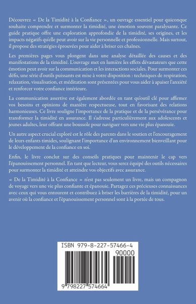 Découvrez De la Timidité à la Confiance , un ouvrage essentiel pour quiconque souhaite comprendre et surmonter la timidité, une émotion souvent paralysante. Ce guide pratique offre une exploration approfondie de la timidité, ses origines, et les impacts négatifs qu'elle peut avoir sur la vie personnelle et professionnelle. Mais surtout, il propose des stratégies éprouvées pour aider à briser ces chaînes. Les premières pages vous plongent dans une analyse détaillée des causes et des manifestations de la timidité. L'ouvrage met en lumière les effets dévastateurs que cette émotion peut avoir sur la communication et les interactions sociales. Pour surmonter ces défis, une série d'outils puissants est mise à votre disposition : techniques de respiration, relaxation, visualisation, et méditation sont présentées pour vous aider à apaiser l'anxiété et renforcer votre confiance intérieure. La communication assertive est également abordée en tant qu'outil clé pour affirmer vos besoins et opinions de manière respectueuse, tout en favorisant des relations harmonieuses. Ce livre souligne l'importance de la pratique et de la persévérance pour transformer la timidité en assurance. Il s'adresse particulièrement aux adolescents et jeunes adultes, leur offrant une boussole pour naviguer vers une vie plus épanouie. Un autre aspect crucial exploré est le rôle des parents dans le soutien et l'encouragement de leurs enfants timides, soulignant l'importance d'un environnement bienveillant pour le développement de la confiance en soi. Enfin, le livre conclut sur des conseils pratiques pour maintenir le cap vers l'épanouissement personnel. En tant que lecteur, vous serez équipé des outils nécessaires pour surmonter la timidité et atteindre vos objectifs avec assurance. De la Timidité à la Confiance n'est pas seulement un livre, mais un compagnon de voyage vers une vie plus confiante et épanouie. Partagez ces précieuses connaissances avec ceux qui vous entourent et contribuez à briser les barrières de la timidité, pour un avenir où la confiance et l'épanouissement personnel sont à la portée de tous.