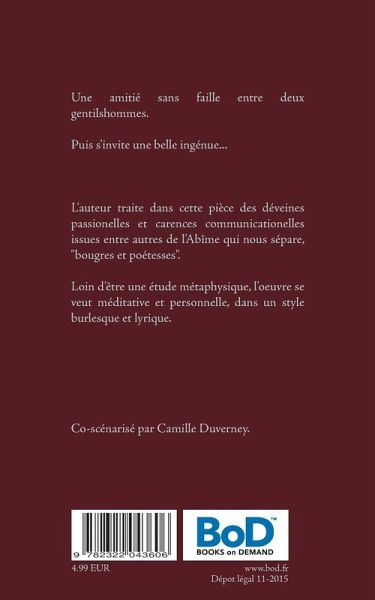 Une amitié sans faille entre deux gentilshommes.Puis s'invite une belle ingénue...L'auteur traite dans cette pièce des déveines passionelles et carences communicationelles issues entre autres de l'Abîme qui nous sépare, "bougres et poétesses".Loin d'être une étude métaphysique, l'oeuvre se veut méditative et personnelle, dans un style burlesque et lyrique.