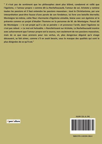 Il n'est pas de sentiment que les philosophes aient plus blâmé, condamné et raillé que l'égoïsme, ' l'amour propre ' comme dit La Rochefoucauld, l'amour de soi. Aristote y ramène toutes les passions et il faut entendre les passions mauvaises ; tout le Christianisme, par une interprétation peut-être fausse d'une parole de son fondateur, lui livre une bataille éternelle; Montaigne lui-même, cette fleur charmante d'égoïsme aimable, biaise avec son égoïsme et le présente comme un projet d'étudier l'homme en la personne de M. de Montaigne. Pascal dit de Montaigne : ' le sot projet qu'il a de se peindre ' et prononce l'arrêt, dont l'égoïsme ne s'est pas relevé : ' Le moi est haïssable. ' Renchérissant sur Aristote, La Rochefoucauld montre avec acharnement que l'amour propre est la source, non seulement de nos passions mauvaises, mais de ce que nous prenons pour nos vertus, et, plus dangereux déguisé qu'à visage découvert, se fait aimer, comme s'il en avait besoin, sous le masque des qualités qui sont le plus éloignées de ce qu'il est vraiment...