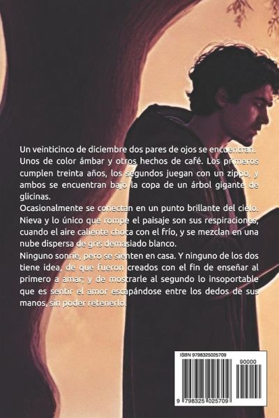Un veinticinco de diciembre dos pares de ojos se encuentran. Unos de color ámbar y otros hechos de café. Los primeros cumplen treinta años, los segundos juegan con un zippo, y ambos se encuentran bajo la copa de un árbol gigante de glicinas. Ocasionalmente se conectan en un punto brillante del cielo. Nieva y lo único que rompe el paisaje son sus respiraciones, cuando el aire caliente choca con el frío, y se mezclan en una nube dispersa de gris demasiado blanco. Ninguno sonríe, pero se sienten en casa. Y ninguno de los dos tiene idea, de que fueron creados con el fin de enseñar al primero a amar; y de mostrarle al segundo lo insoportable que es sentir el amor escapándose entre los dedos de sus manos, sin poder retenerlo.