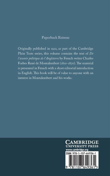 Originally published in 1922, as part of the Cambridge Plain Texts series, this volume contains the text of De l'avenir politique de l'Angleterre by French writer Charles Forbes René de Montalembert (1810-70). The material is presented in French with a short editorial introduction in English. This book will be of value to anyone with an interest in Montalembert and his works.
