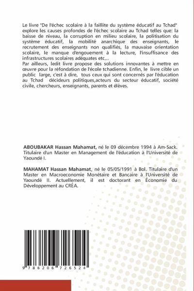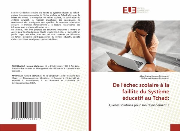 Le livre "De l'échec scolaire à la faillite du système éducatif au Tchad" explore les causes profondes de l'échec scolaire au Tchad telles que: la baisse de niveau, la corruption en milieu scolaire, la politisation du système éducatif, la mobilité anarchique des enseignants, le recrutement des enseignants non qualifiés, la mauvaise orientation scolaire, le manque d'engouement à la lecture, l'insuffisance des infrastructures scolaires adéquates etc...Par ailleurs, ledit livre propose des solutions innovantes à mettre en oeuvre pour la réfondation de l'école tchadienne. Enfin, le livre cible un public large, c'est à dire, tous ceux qui sont concernés par l'éducation au Tchad décideurs politiques,acteurs du secteur éducatif, société civile, chercheurs, enseignants, parents et élèves.