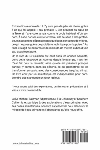 Extraordinaire nouvelle : il n'y aura pas de pénurie d'eau, grâce à ce qui est appelé eau primaire . Elle provient du cur de la Terre et n'a encore jamais connu le cycle habituel, d'où son nom. À l'abri dans la croûte terrestre, elle se situe à des profondeurs ne dépassant pas souvent quelques centaines de mètres, ce qui ne pose guère de problème technique pour la puiser.* Au final, il s'agit de milliards et de milliards de mètres cubes d'une eau quasiment pure. Or, le livre du Dr Salzman est écrit dans les années soixante, donc cette ressource est connue depuis longtemps, mais rien n'est fait pour la recueillir, alors qu'elle est présente presque partout, y compris dans les déserts, ce qui permettrait de les transformer en oasis, avec des conséquences jusqu'au climat. Ce livre écrit par un scientifique est indispensable pour comprendre que s'annonce un futur radieux. * Nous avons suivi des explorations, un film est en préparation et sera diffusé sur www.novimondi.tv.
