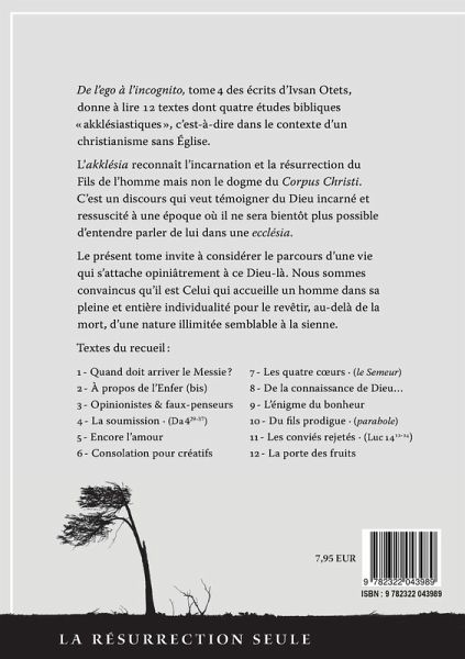 De l'ego à l'incognito, tome 4 des écrits d'Ivsan Otets, donne à lire 12 textes dont quatre études bibliques de type "akklésiastique", c'est-à-dire dans le contexte d'un christianisme sans Église.L'akklésia reconnaît l'incarnation et la résurrection du Fils de l'homme mais non le dogme du Corpus Christi. C'est un discours qui veut témoigner du Dieu incarné et ressuscité à une époque où il ne sera bientôt plus possible d'entendre parler de lui dans une ecclésia.Le présent tome invite à considérer le parcours d'une vie qui s'attache opiniâtrement à ce Dieu-là. Nous sommes convaincus qu'il est Celui qui accueille un homme dans sa pleine et entière individualité pour le revêtir, au-delà de la mort, d'une nature illimitée semblable à la sienne.Textes du recueil :1. Quand doit arriver le Messie ? 2. À propos de l'Enfer (bis) 3. Opinionistes & faux-penseurs 4. La soumission (Da 4,29-37) 5. Encore l'amour 6. Consolation pour créatifs 7. Les quatre coeurs (le Semeur) 8. De la connaissance de Dieu... 9. L'énigme du bonheur 10. Du fils prodigue (parabole) 11. Les conviés rejetés (Luc 14,12-24) 12. La porte des fruits