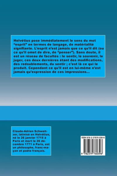 Helvétius pose immédiatement le sens du mot "esprit" en termes de langage, de matérialité signifiante. L'esprit n'est jamais que ce qu'il dit (ou ce qu'il omet de dire, de "penser"). Sans doute, il est un réseau de facultés : le sentir, le souvenir, le juger, ces deux dernières étant des modifications, des redoublements, du sentir ; c'est là ce qui le produit. Cependant ce qu'il est en lui-même n'est jamais qu'expression de ces impressions...