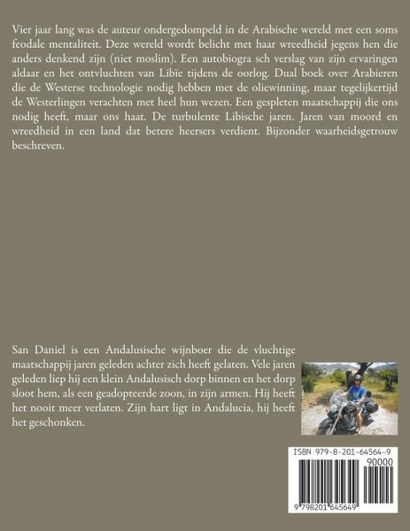 Vier jaar lang was de auteur ondergedompeld in de Arabische wereld met een soms feodale mentaliteit. Deze wereld wordt belicht met haar wreedheid jegens hen die anders denkend zijn (niet moslim). Een autobiogra sch verslag van zijn ervaringen aldaar en het ontvluchten van Libïe tijdens de oorlog. Dual boek over Arabieren die de Westerse technologie nodig hebben met de oliewinning, maar tegelijkertijd de Westerlingen verachten met heel hun wezen. Een gespleten maatschappij die ons nodig heeft, maar ons haat. De turbulente Libische jaren. Jaren van moord en wreedheid in een land dat betere heersers verdient. Bijzonder waarheidsgetrouw beschreven. San Daniel is een Andalusische wijnboer die de vluchtige maatschappij jaren geleden achter zich heeft gelaten. Vele jaren geleden liep hij een klein Andalusisch dorp binnen en het dorp sloot hem, als een geadopteerde zoon, in zijn armen. Hij heeft het nooit meer verlaten. Zijn hart ligt in Andalucia, hij heeft het geschonken.
