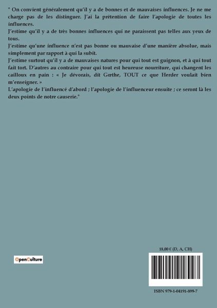 " On convient généralement qüil y a de bonnes et de mauvaises influences. Je ne me charge pas de les distinguer. J¿ai la prétention de faire l¿apologie de toutes les influences. J¿estime qüil y a de très bonnes influences qui ne paraissent pas telles aux yeux de tous. J¿estime qüune influence n¿est pas bonne ou mauvaise d¿une manière absolue, mais simplement par rapport à qui la subit. J¿estime surtout qüil y a de mauvaises natures pour qui tout est guignon, et à qui tout fait tort. D¿autres au contraire pour qui tout est heureuse nourriture, qui changent les cailloux en pain : « Je dévorais, dit G¿the, TOUT ce que Herder voulait bien m¿enseigner. » L¿apologie de l¿influencé d¿abord ; l¿apologie de l¿influenceur ensuite ; ce seront là les deux points de notre causerie."