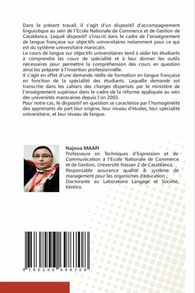 Dans le présent travail, il s'agit d'un dispositif d'accompagnement linguistique au sein de l'Ecole Nationale de Commerce et de Gestion de Casablanca. Lequel dispositif s'inscrit dans le cadre de l'enseignement de langue française sur objectifs universitaires notamment pour ce qui est du système universitaire marocain.Le cours de langue sur objectifs universitaires tend à aider les étudiants à comprendre les cours de spécialité et à leur donner les outils nécessaires pour permettre la compréhension des cours en question ainsi les préparer à l'insertion professionnelle. Il s'agit en effet d'une demande réelle de formation en langue française en fonction de la spécialité des étudiants. Laquelle demande est transcrite dans les cahiers des charges dispensés par le ministère de l'enseignement supérieur dans le cadre de la réforme appliquée au sein des universités marocaines depuis l'an 2003.Pour notre cas, le dispositif en question se caractérise par l'homogénéité des apprenants de part leur origine, leur niveau d'études, leur spécialité universitaire, et leur niveau de langue.