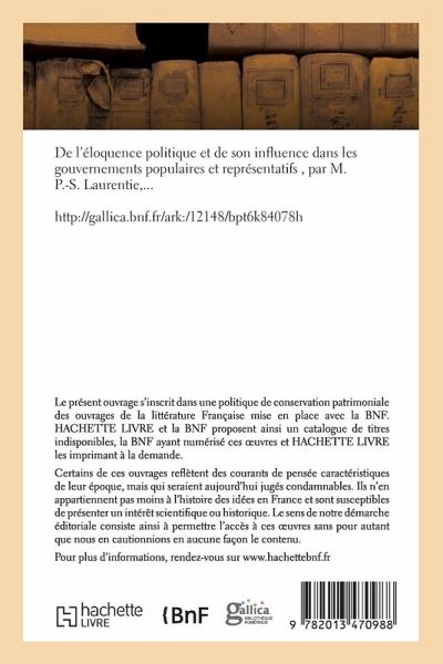 De l'éloquence politique et de son influence dans les gouvernements populaires et représentatifs, par M. P.-S. Laurentie, ... Date de l'édition originale: 1819 Le présent ouvrage s'inscrit dans une politique de conservation patrimoniale des ouvrages de la littérature Française mise en place avec la BNF. HACHETTE LIVRE et la BNF proposent ainsi un catalogue de titres indisponibles, la BNF ayant numérisé ces oeuvres et HACHETTE LIVRE les imprimant à la demande. Certains de ces ouvrages reflètent des courants de pensée caractéristiques de leur époque, mais qui seraient aujourd'hui jugés condamnables. Ils n'en appartiennent pas moins à l'histoire des idées en France et sont susceptibles de présenter un intérêt scientifique ou historique. Le sens de notre démarche éditoriale consiste ainsi à permettre l'accès à ces oeuvres sans pour autant que nous en cautionnions en aucune façon le contenu. Pour plus d'informations, rendez-vous sur www.hachettebnf.fr