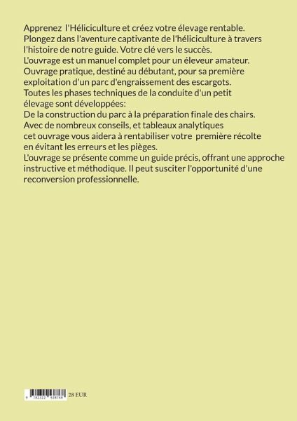 Apprenez l'Héliciculture et créez votre élevage rentable.Plongez dans l'aventure captivante de l'héliciculture à traversl'histoire de notre guide. Votre clé vers le succès.L'ouvrage est un manuel complet pour un éleveur amateur. Ouvrage pratique, destiné au débutant, pour sa première exploitation d'un parc d'engraissement des escargots. Toutes les phases techniques de la conduite d'un petit élevage sont développées. De la construction du parc à la préparation finale des chairs. Avec de nombreux conseils, illustrations et tableaux analytiquescet ouvrage vous aidera à rentabiliser votre première récolte en évitant les erreurs et les pièges.