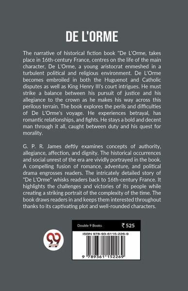 The narrative of historical fiction book "De L'Orme, takes place in 16th-century France, centres on the life of the main character, De L'Orme, a young aristocrat enmeshed in a turbulent political and religious environment. De L'Orme becomes embroiled in both the Huguenot and Catholic disputes as well as King Henry III's court intrigues. He must strike a balance between his pursuit of justice and his allegiance to the crown as he makes his way across this perilous terrain. The book explores the perils and difficulties of De L'Orme's voyage. He experiences betrayal, has romantic relationships, and fights. He stays a bold and decent man through it all, caught between duty and his quest for morality. G. P. R. James deftly examines concepts of authority, allegiance, affection, and dignity. The historical occurrences and social unrest of the era are vividly portrayed in the book. A compelling fusion of romance, adventure, and political drama engrosses readers. The intricately detailed story of "De L'Orme" whisks readers back to 16th-century France. It highlights the challenges and victories of its people while creating a striking portrait of the complexity of the time. The book draws readers in and keeps them interested throughout thanks to its captivating plot and well-rounded characters.