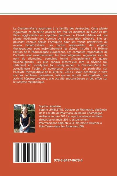 Le Chardon-Marie appartient à la famille des Astéracées. Cette plante vigoureuse et épineuse possède des feuilles marbrées de blanc et des fleurs agglomérées en capitules pourpres. Le Chardon-Marie est une plante médicinale peu connue de la population générale. Elle est pourtant connue depuis l Antiquité pour ses vertus protectrices au niveau hépato-biliaire. Les parties responsables des emplois thérapeutiques sont majoritairement les akènes, inscrits à la Sixième Edition de la Pharmacopée Européenne. Les composés responsables de l activité sont essentiellement les flavanolignanes, regroupés sous le nom de silymarine, complexe formé principalement de quatre flavanolignanes. Les plus connus d entre-eux sont la silybine (ou silibinine) et l isosilybine (ou isosilybinine). Le Chardon-Marie fait actuellement l objet de nombreuses recherches, en particulier sur l activité thérapeutique de la silybine. Celle-ci serait bénéfique in vitro sur des nombreux paramètres, tels qu une activité anti-oxydante, une activité hépatoprotectrice, une activité anticancéreuse et des effets sur le système métabolique.