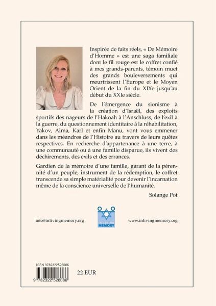 Inspirée de faits réels, "De Mémoire d'Hommes" est une saga familiale dont le fil rouge est le coffret confié à mes grands-parents, témoin muet des grands bouleversements qui ont marqué l'Europe et le Moyen-Orient de la fin du XIXe siècle jusqu'au début du XXIe siècle.De l'émergence du sionisme à la création d'Israël, des exploits sportifs des nageurs de l'Hakoah à l'Anschluss, de l'exil à la guerre, du questionnement identitaire à la réhabilitation, Yakov, Alma, Karl et enfin Manu vous emmèneront dans les méandres de l'Histoire à travers leurs quêtes respectives. En quête d'appartenance à une terre, à une communauté ou à une famille disparue, ils vivent des déchirements, des exils et des errances.Gardien de la mémoire d'une famille, garant de la pérennité d'un peuple, instrument de la rédemption, le coffret transcende sa simple matérialité pour devenir l'incarnation même de la conscience universelle de l'humanité.
