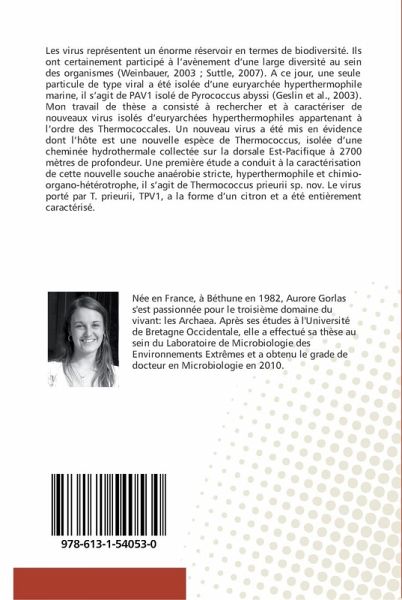 Les virus représentent un énorme réservoir en termes de biodiversité. Ils ont certainement participé à l'avènement d'une large diversité au sein des organismes (Weinbauer, 2003 ; Suttle, 2007). A ce jour, une seule particule de type viral a été isolée d'une euryarchée hyperthermophile marine, il s'agit de PAV1 isolé de Pyrococcus abyssi (Geslin et al., 2003). Mon travail de thèse a consisté à rechercher et à caractériser de nouveaux virus isolés d'euryarchées hyperthermophiles appartenant à l'ordre des Thermococcales. Un nouveau virus a été mis en évidence dont l'hôte est une nouvelle espèce de Thermococcus, isolée d'une cheminée hydrothermale collectée sur la dorsale Est-Pacifique à 2700 mètres de profondeur. Une première étude a conduit à la caractérisation de cette nouvelle souche anaérobie stricte, hyperthermophile et chimio-organo-hétérotrophe, il s'agit de Thermococcus prieurii sp. nov. Le virus porté par T. prieurii, TPV1, a la forme d'un citron et a été entièrement caractérisé.