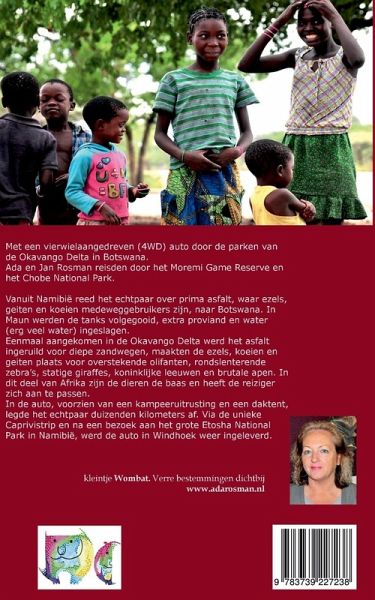 Met een vierwielaangedreven auto door de rauwe en ruwe parken van de Okavanga Delta in Botswana. Ada en Jan reisden door het Moremi en Chobe Nationale Park. De auteur en haar echtgenoot maakten een reis door een deel van Botswana. Vanuit Windhoek reden ze over prima asfalt, waar ezels, geiten en koeien medeweggebruikers zijn, naar Botswana. In Maun werden de tanks volgegooid, extra proviand en water, erg veel water ingeslagen. Eenmaal aangekomen in de Okavanga Delta werd het asfalt ingeruild voor diepe zandwegen, maakten de ezels, koeien en geiten plaats voor overstekende olifanten, zebräs, giraffen en brutale apen. In dit deel van Afrika zijn de dieren de baas en heeft de reiziger zich aan te passen. In een 4 x 4 auto, volledig ingericht met een kampeeruitrusting en daktent, reisde het echtpaar duizenden kilometers door Botswana. - 92 pagina's vol reisbelevenissen en tips - 10 pagina's met kleurenfoto's - landkaart - literatuurlijst