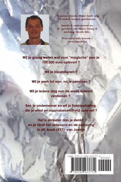 Wij je graag weten wat voor ''magische'' pen je 100.000 euro oplevert ? Wil je bijverdienen ? Wil je werk tot aan, na je pensioen ? Wil je iedere dag van de week kunnen verdienen ? Ben je ondernemer en wil je fieldmarketing, die je winst en naamsbekendheid oplevert ? Het is simpeler dan je denkt, en je vindt het antwoord en de oplossing in dit boek (#17) van Jasmin